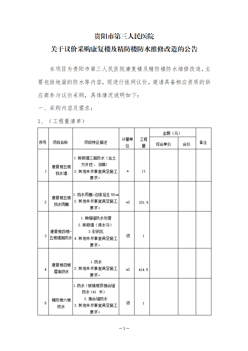 贵阳市第三人民医院 关于议价采购康复楼及精防楼防水维修改造的公告