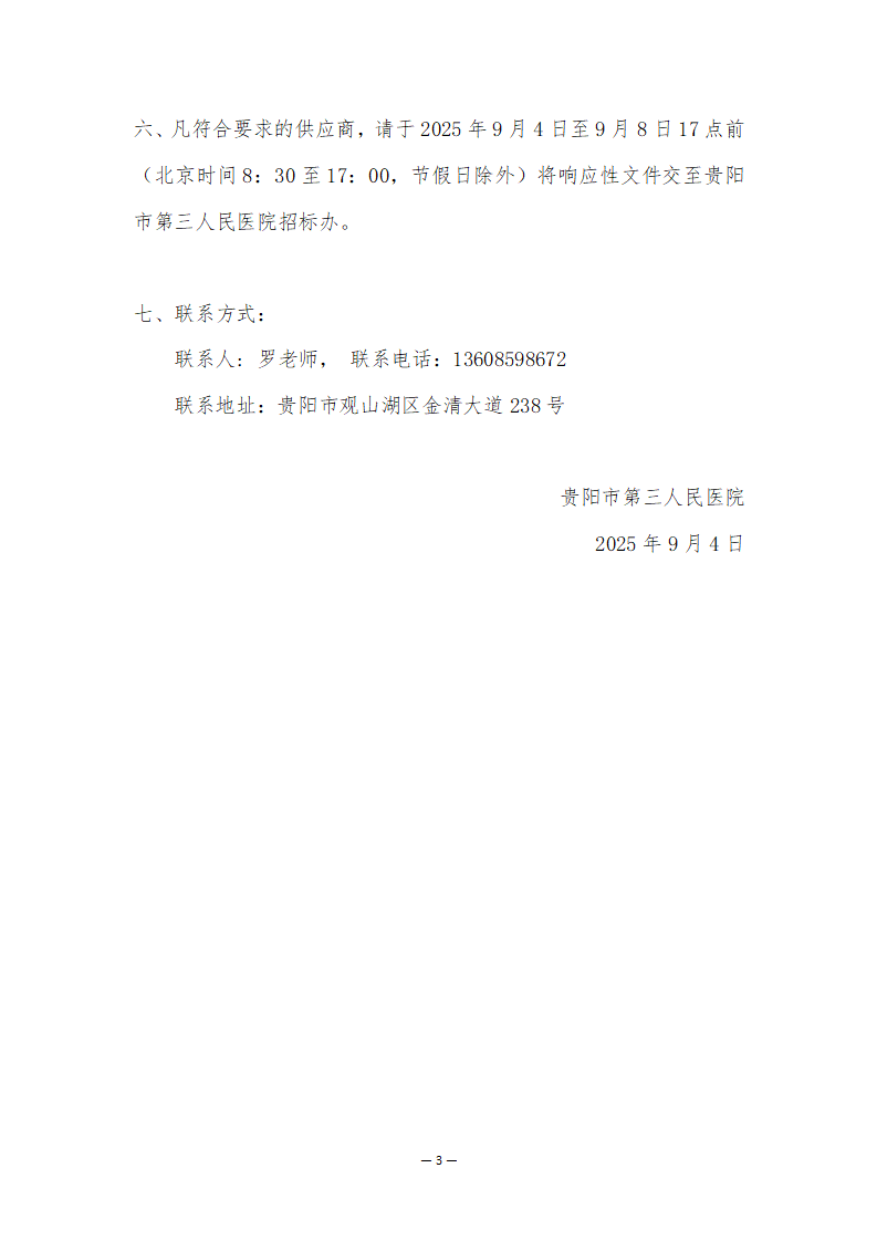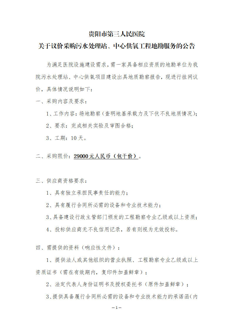 贵阳市第三人民医院 关于议价采购污水处理站、中心供氧工程地勘服务的公告