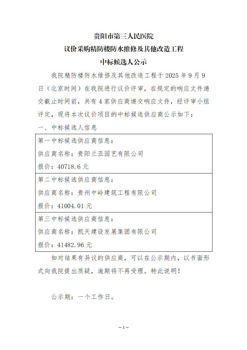 贵阳市第三人民医院 议价采购精防楼防水维修及其他改造工程 中标候选人公示
