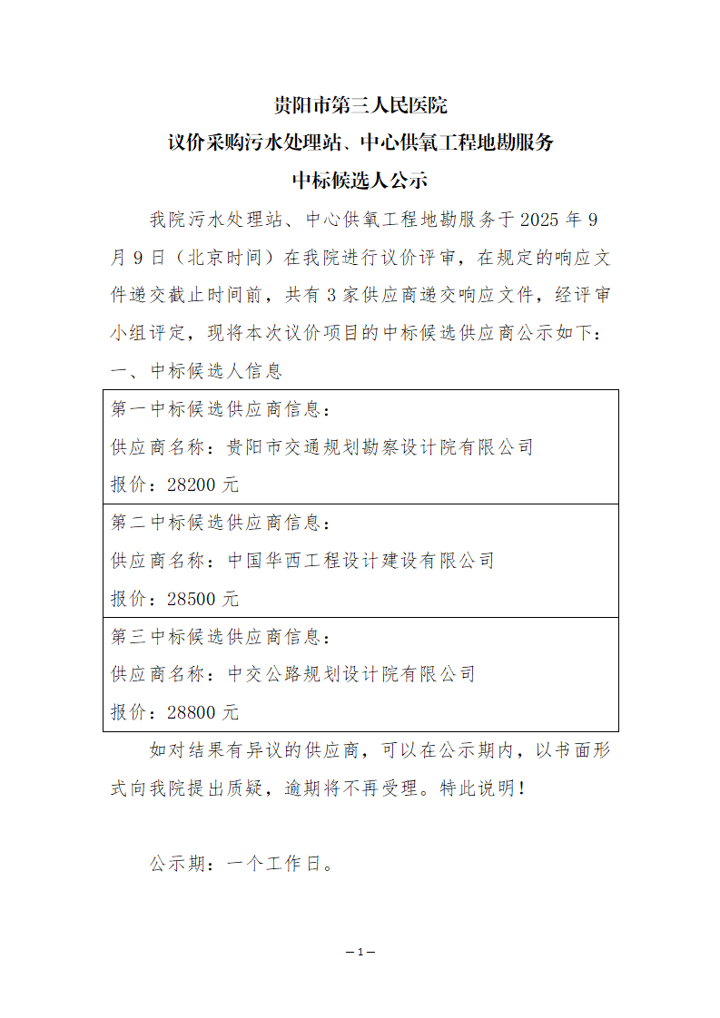 贵阳市第三人民医院 议价采购污水处理站、中心供氧工程地勘服务 中标候选人公示