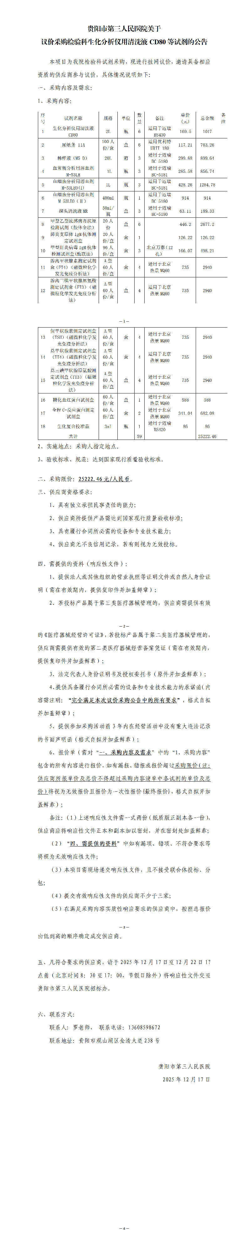 贵阳市第三人民医院关于 议价采购检验科生化分析仪用清洗液CD80等试剂的公告