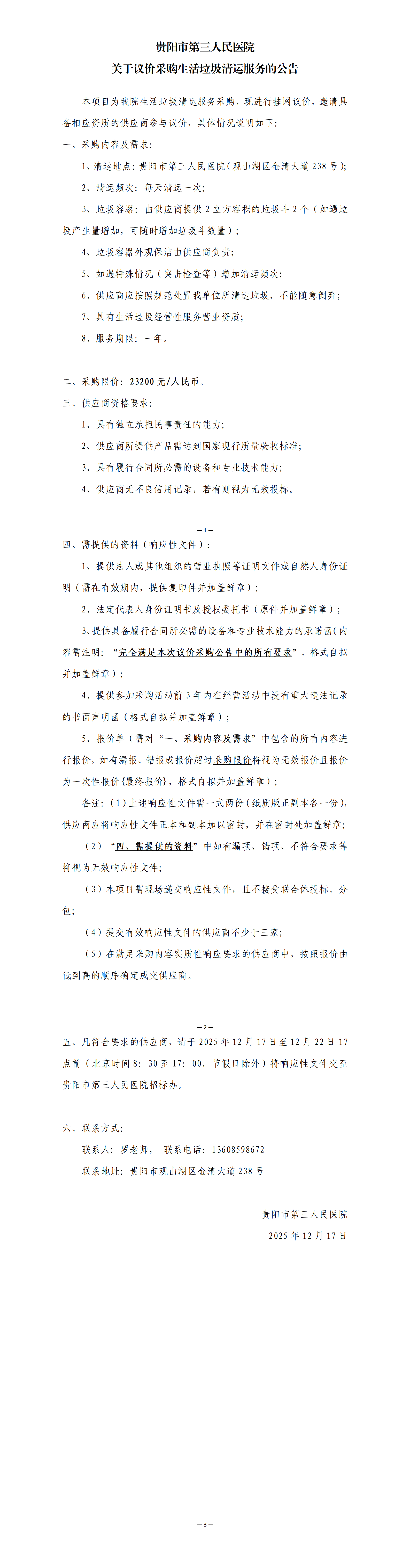 贵阳市第三人民医院 关于议价采购生活垃圾清运服务的公告
