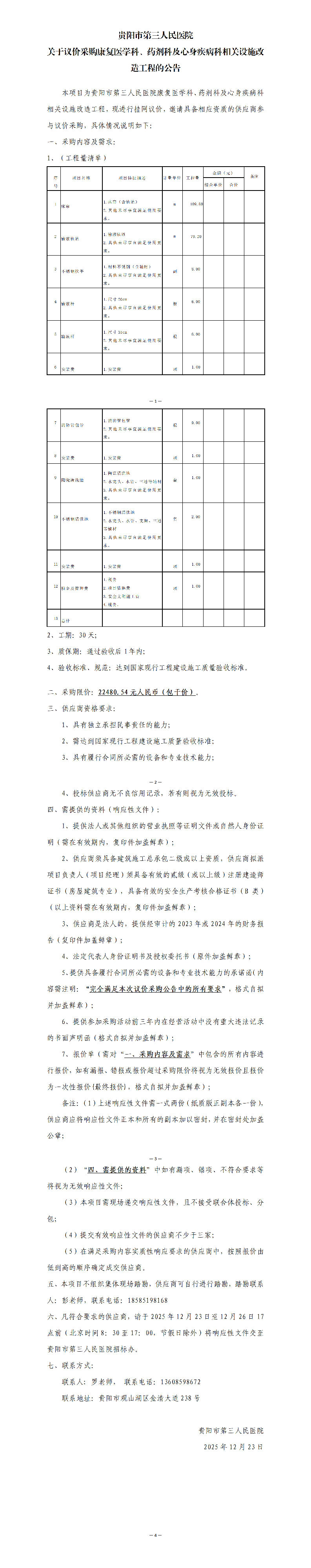 贵阳市第三人民医院 关于议价采购康复医学科、药剂科及心身疾病科相关设施改造工程的公告