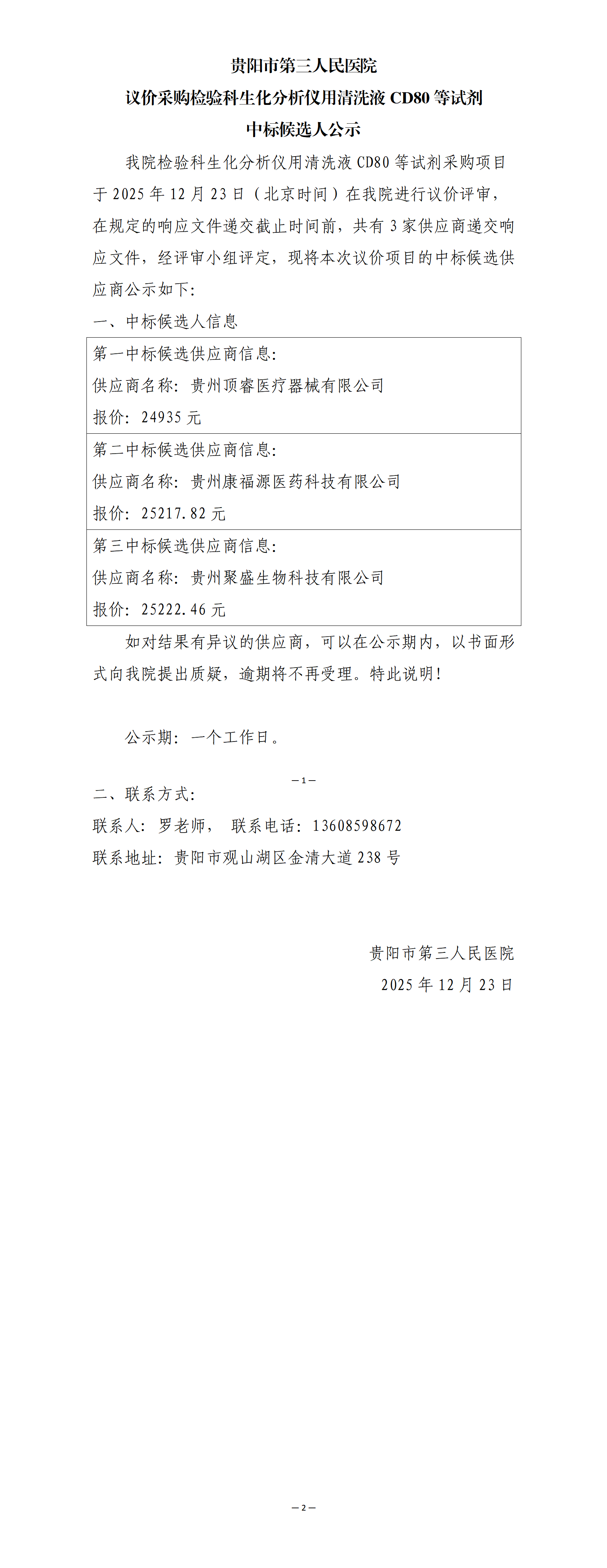贵阳市第三人民医院 议价采购检验科生化分析仪用清洗液CD80等试剂 中标候选人公示