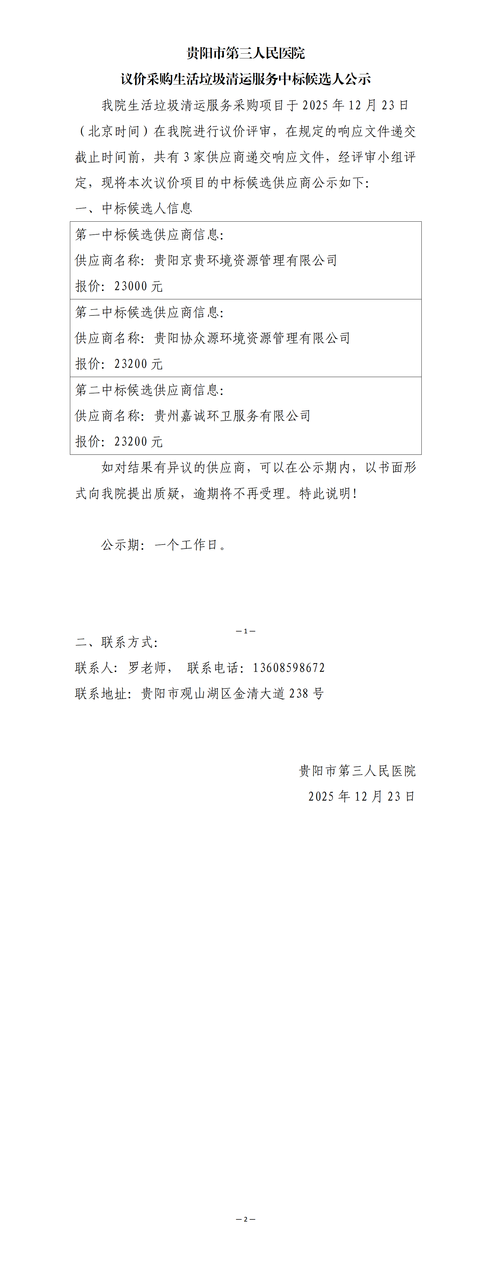 贵阳市第三人民医院 议价采购生活垃圾清运服务中标候选人公示