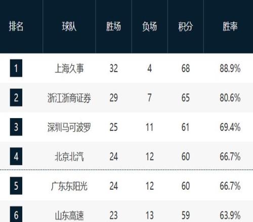 不过第四名的竞争还是非常激烈,北京、广东和山东胜场的差距不大,当然后续山东的赛程难度非常大,估计还是会以北京和广东的竞争第四为主,现在他们的战绩还是一样的,同时这两支球队还非常不稳定,看看到时谁能奠定第四的位置吧。