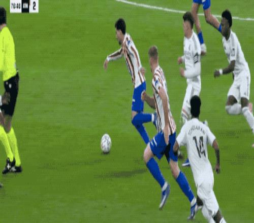 第52分钟,汉茨科头脑发热,在几乎零度角的位置,放倒了迪亚斯,裁判果断判罚点球。维尼修斯操刀,一蹴而就。